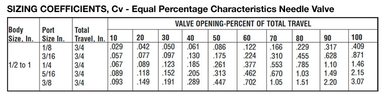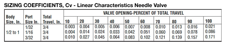 Needle plugs are available in the 1/2″, 3/4″, and 1″ valve body sizes. The linear needle plug sizes are 3/32″, 1/16″, and 1/32″, and the equal percentage plug sizes are 3/8", 5/16", 1/4", 3/16", and 1/8". Shown below are flow rate charts with the drop in flow coefficient values for these needle plug options.