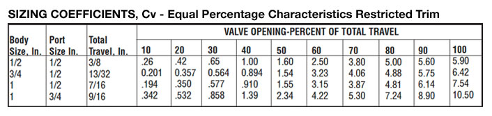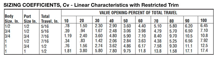 The Hi-Flow™ Series offers restricted trim (which has a smaller port size) in the 3/4″ and 1″ size valve body. This allows a reduction in flow rate through the valve without a reduction in pipe size. The 1″ valve body is available with 3/4″ and 1/2″ port sizes, and the 3/4″ valve body is available in a 1/2″ port size. The restricted trim is available in either linear or equal percentage flow characteristics. Shown below are flow rate charts with the drop in flow coefficient values for these restricted trim options
