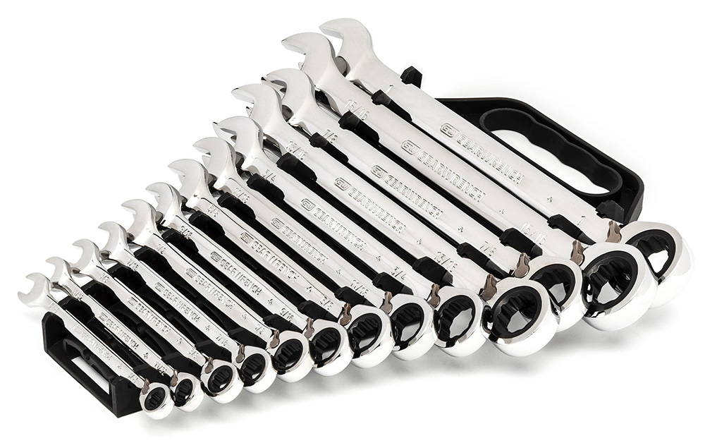 Durable and easy-to-use, this kit comes with 13 reversible ratcheting combination wrenches that meet or exceed ASME and ANSI specifications and are a staple for every toolbox. In addition, the 72-tooth ratcheting box ends on these wrenches need a minimal 5° to move fasteners versus 30° for standard wrenches.