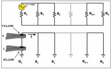 the user simply clamps the optional ICLAMP and VCLAMP around the ground under the test in the manner prescribed in the operator's manual and takes the reading. A defined test voltage is injected into the system using the VCLAMP, including a current, I, to flow and be measured by the ICLAMP. The instrument then calculates the approximate resistance of the ground under test.