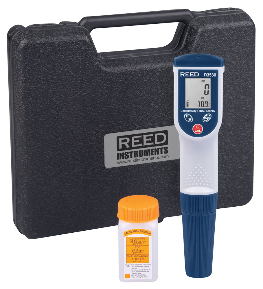 Digital pen-style meter displays both temperature and conductivity, total dissolved solids (TDS), or salt levels simultaneously on a dual LCD display. The R3530 features Data hold and Max/Min functions, Automatic Temperature Compensation (ATC), and a built-in calibration procedure.
