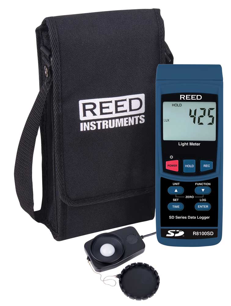 The R8100SD has a wide measurement range up to 100,000 Lux (10,000 Foot-candles) and features Data hold, Max/Min functions, and an easy-to-read backlit LCD display. Using a SD card (max 16GB), a user can manually record up to 99 readings or automatically by selecting a desired sampling rate from 1 to 3600 seconds. Quickly generate an Excel file with raw data, all without the use of software. Optional accessories include a tripod and AC adapter for continuous long-term monitoring.