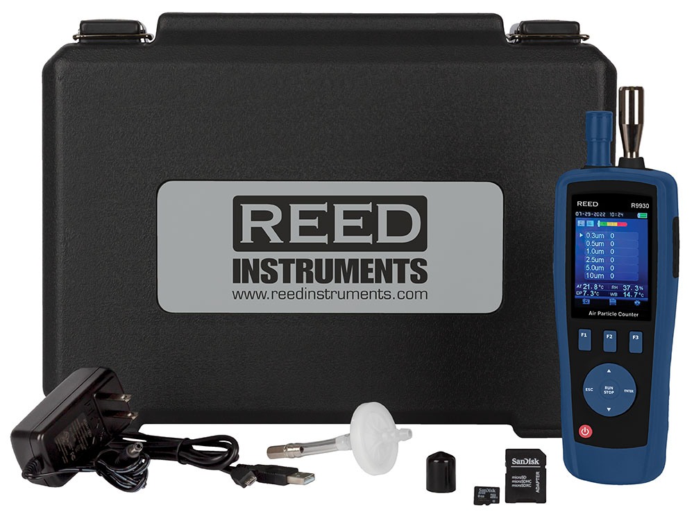 This Air Particle Counter offers quick and accurate measurements of particle sizes down to 0.3µm. The R9930 also measures air temperature, relative humidity, dew point, and wet bulb. Using the included 8GB Micro SD memory card, a user can capture videos, images, and particle logs which can be further analyzed with the included software.