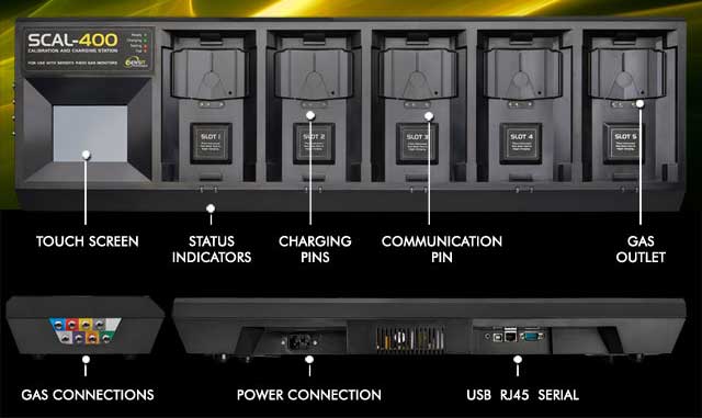 The SCal-400 is extremely easy to use, simply place the P400 meter onto any of the five slots to charge and connect for Data Transfer. Testing is fully automated and requires no user interactions. The station automatically detects when an instrument requires a bump or calibration, and then performs the required test.