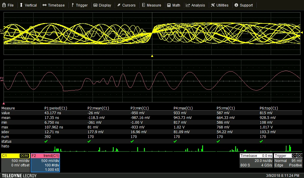 A 1 GHz analog bandwidth with up to 4 GS/s (single-shot) sample rate, 20 Mpts memory (interleaved), and a standard collection of math, measurement, debug, and documentation tools provides outstanding and unsurpassed anomaly detection and analysis capabilities.