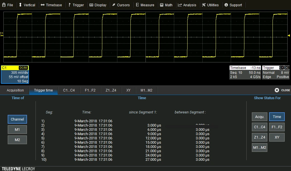 | Internal Waveform Memory | 2 active waveform memory traces (M1-M2) store 16-bit/point full-length waveforms. Waveforms can be stored to 2 file locations on the scope or the microSD, limited only by the data storage media capacity |