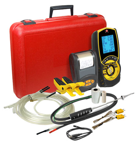 Ideal for combustion analysis, this flue gas analyzer offers essential information for installing and maintaining gas appliances and the LINK feature connects wireless probes. This kit includes a flue probe, wireless pipe clamp probes, K-type thermocouples, and an IR thermal printer.